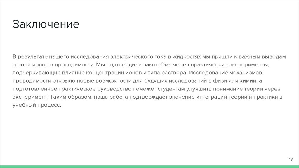 ЗаключениеВ результате нашего исследования электрического тока в жидкостях мы пришли к важным выводам