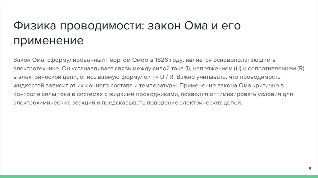жидкостей зависит от их ионного состава и температуры. Применение закона Ома критично в