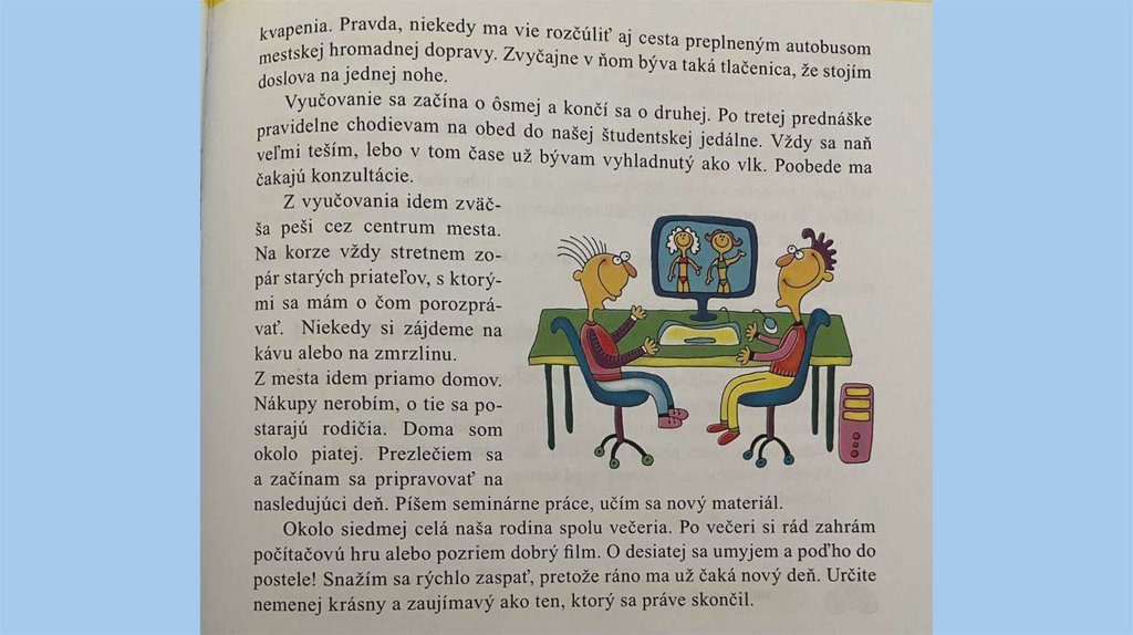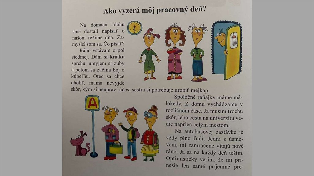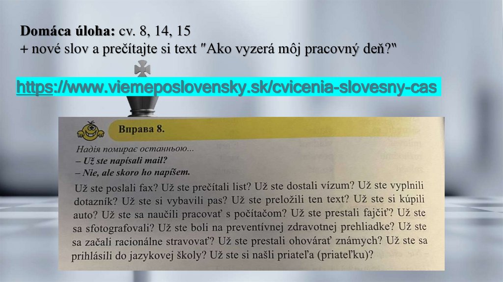 Domáca úloha: cv. 8, 14, 15+ nové slov a prečítajte si text ″Ako vyzerá môj pracovný deň?‶