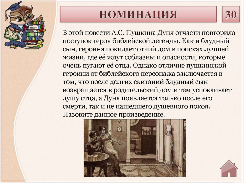 В этой повести А.С. Пушкина Дуня отчасти повторилапоступок героя библейской легенды. Как и блудный