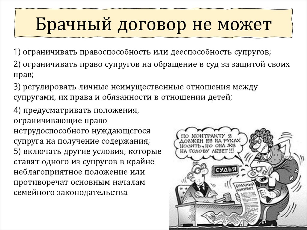 Брачный договор не может1) ограничивать правоспособность или дееспособность супругов;