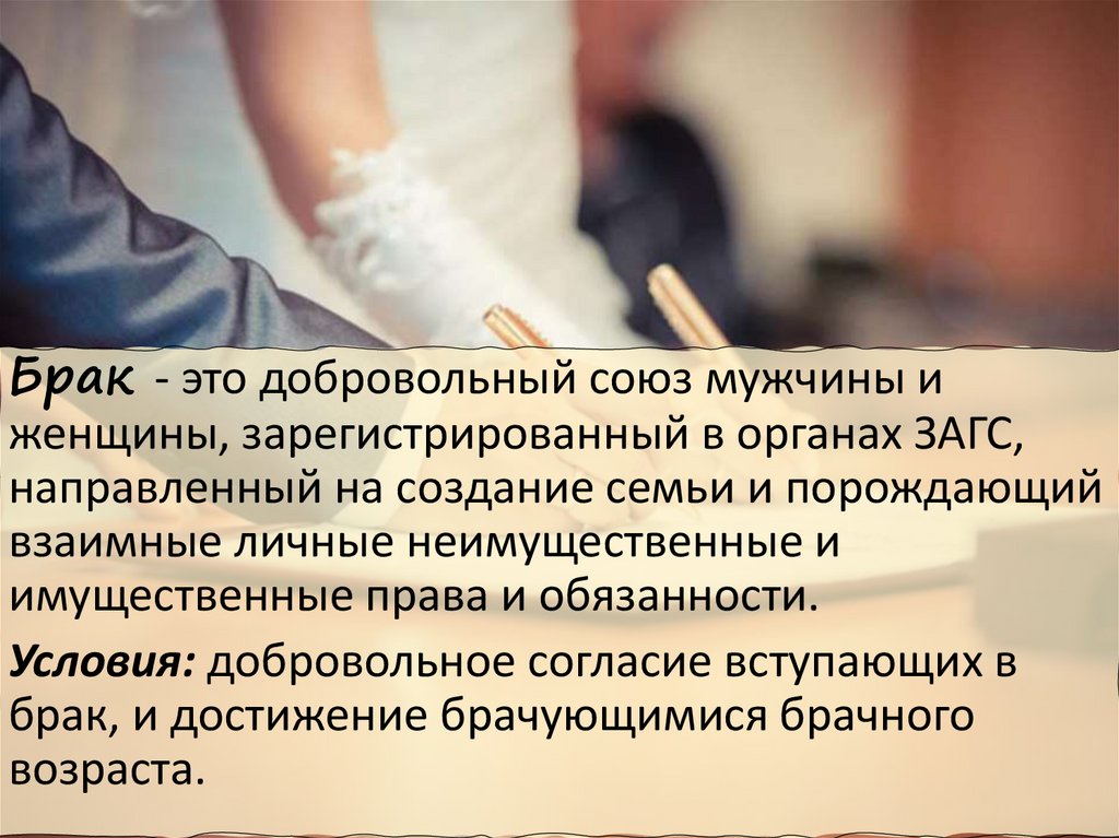 Брак - это добровольный союз мужчины иженщины, зарегистрированный в органах ЗАГС,