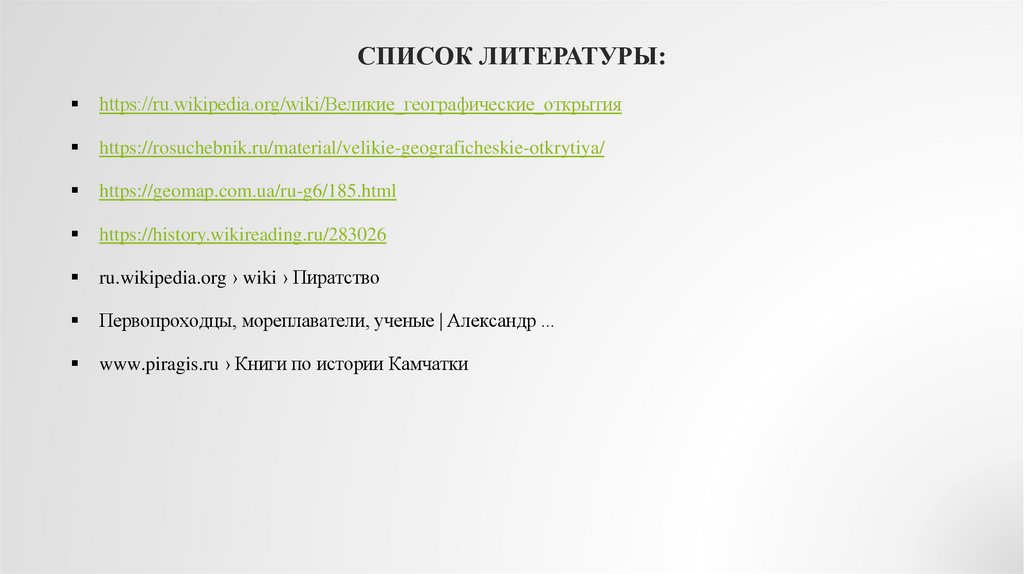 СПИСОК ЛИТЕРАТУРЫ:https://ru.wikipedia.org/wiki/Великие_географические_открытия