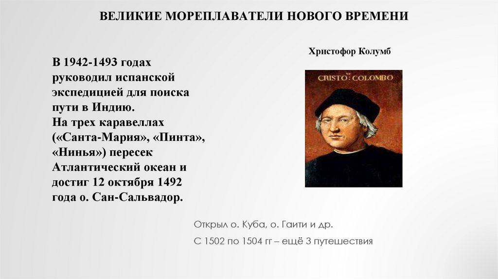 ВЕЛИКИЕ МОРЕПЛАВАТЕЛИ НОВОГО ВРЕМЕНИВ 1942-1493 годах