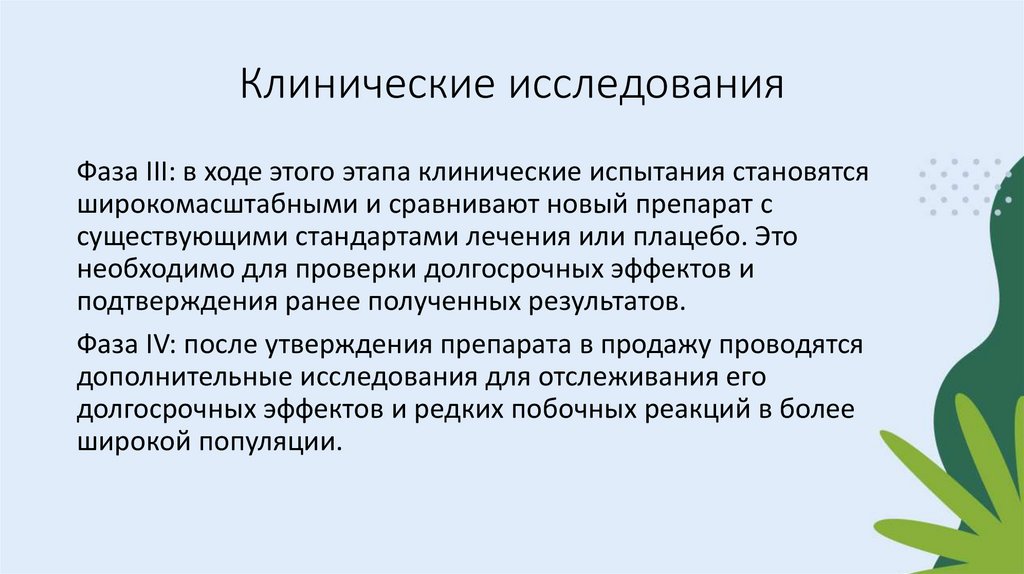 Клинические исследованияФаза III: в ходе этого этапа клинические испытания становятся