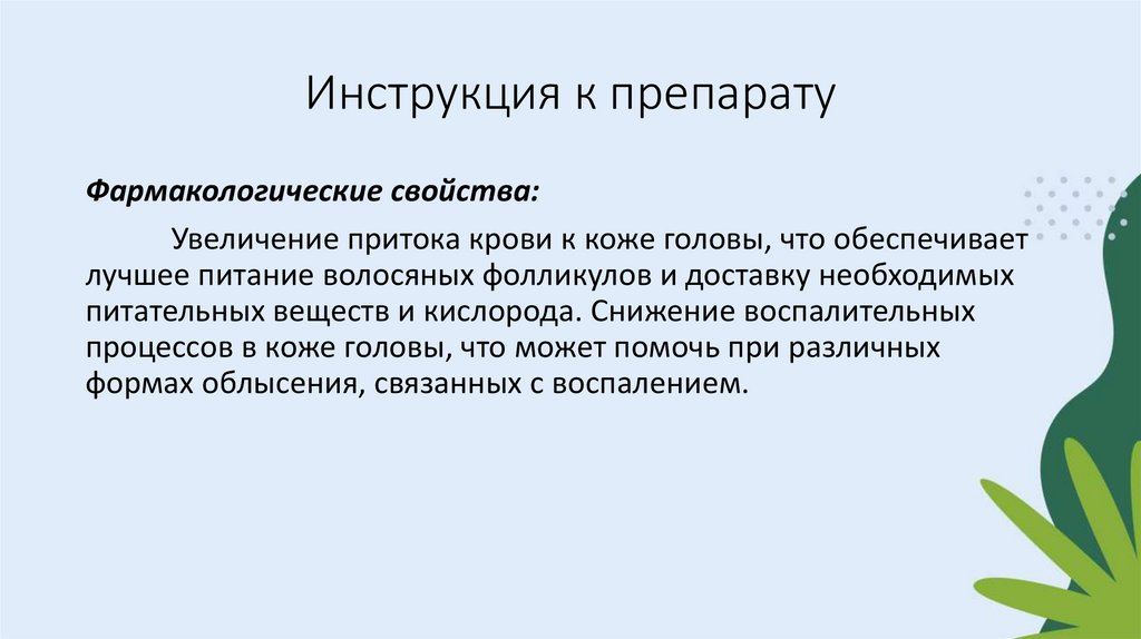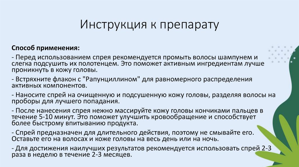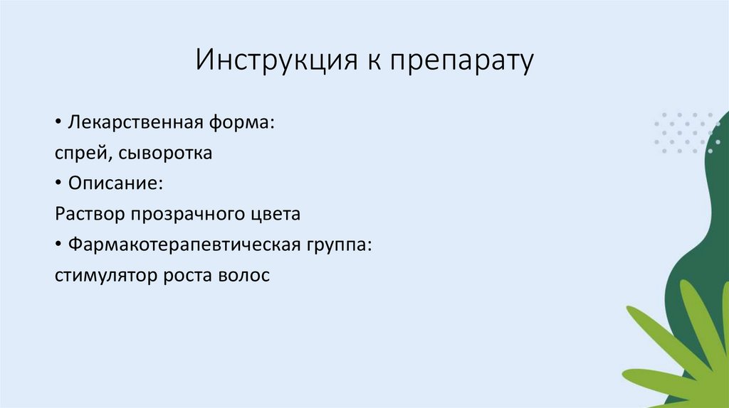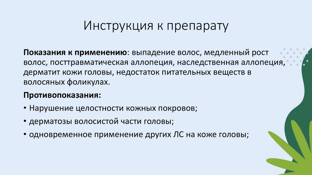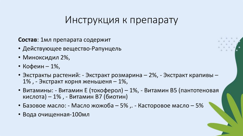 Инструкция к препаратуПоказания к применению: выпадение волос, медленный рост