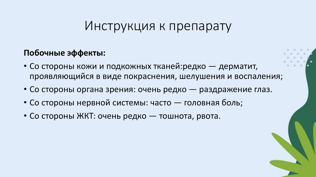 • Со стороны органа зрения: очень редко — раздражение глаз.