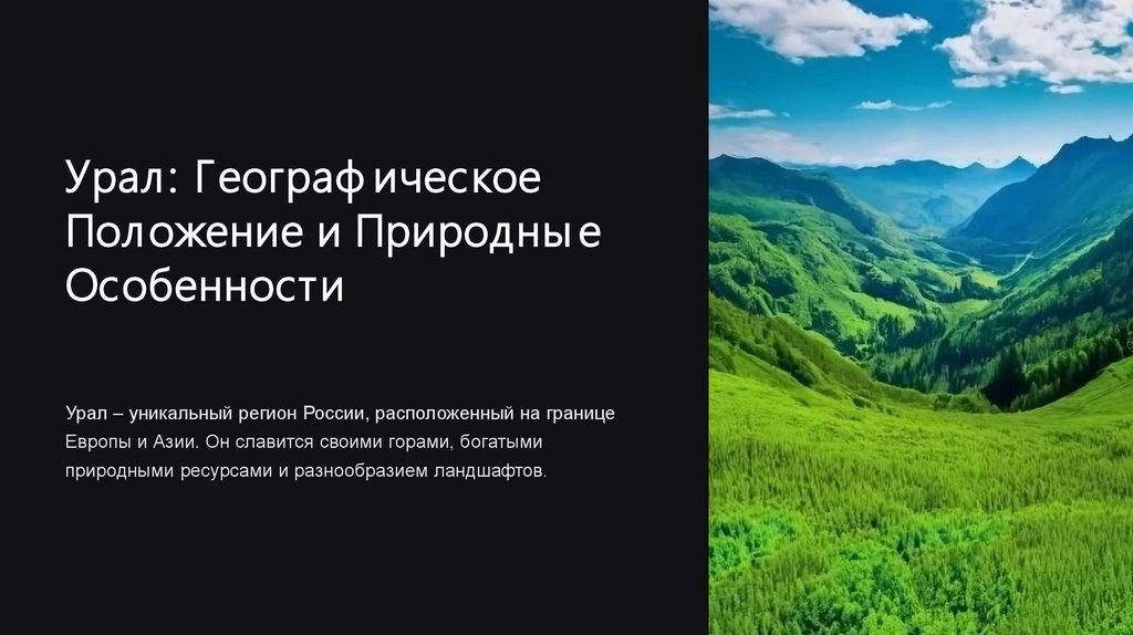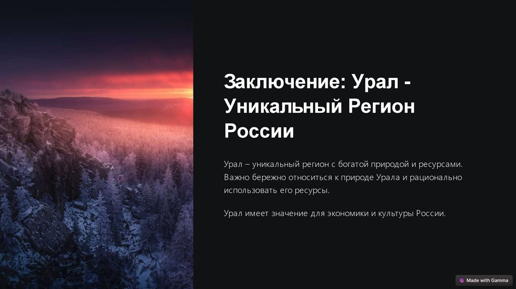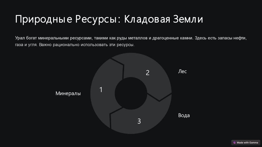 Природны е Ресурсы : Кладовая ЗемлиУрал богат минеральными ресурсами, такими как руды металлов и драгоценные камни. Здесь есть запасы нефти,