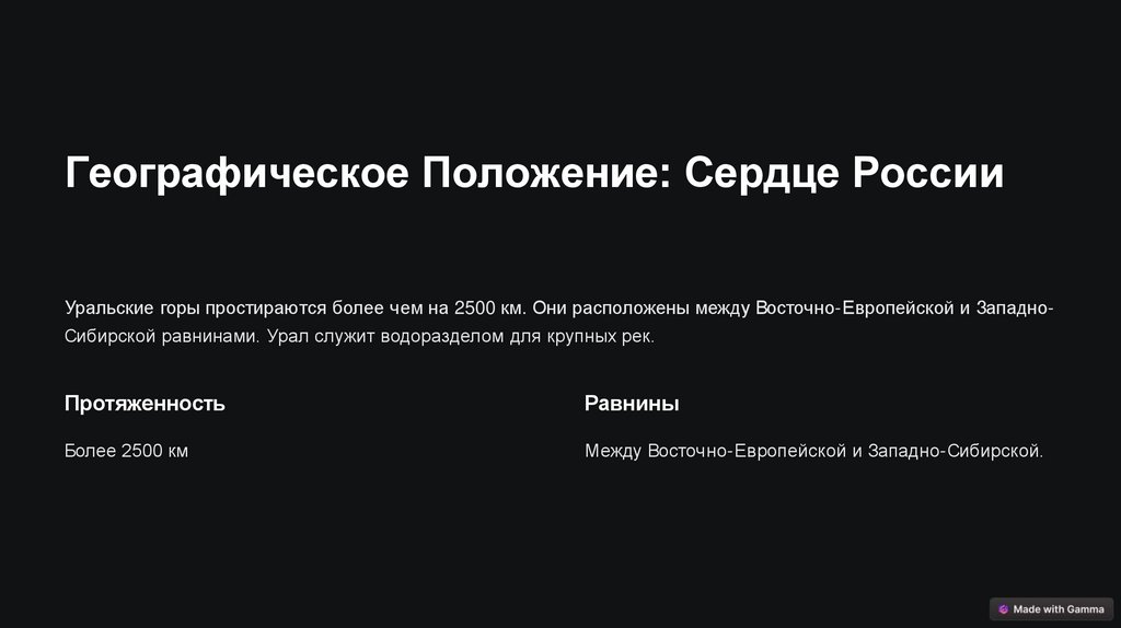 Географическое Положение: Сердце РоссииУральские горы простираются более чем на 2500 км. Они расположены между Восточно-Европейской и ЗападноСибирской равнинами. Урал служит водоразделом для крупных рек.