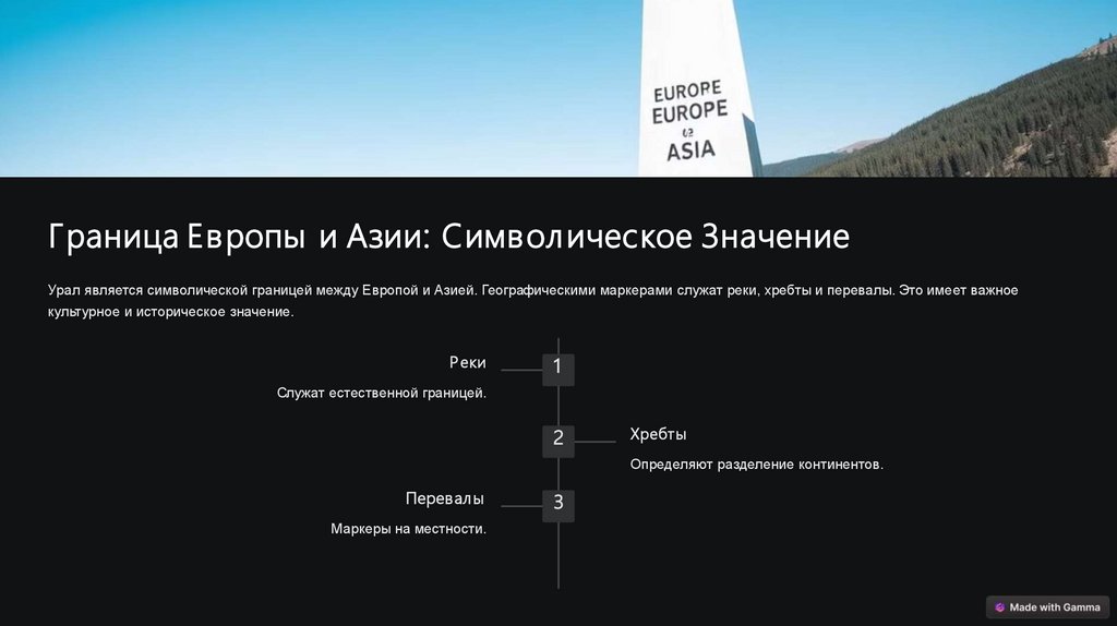 Граница Европы и Азии: Символическое ЗначениеУрал является символической границей между Европой и Азией. Географическими маркерами служат реки, хребты и перевалы. Это имеет важное