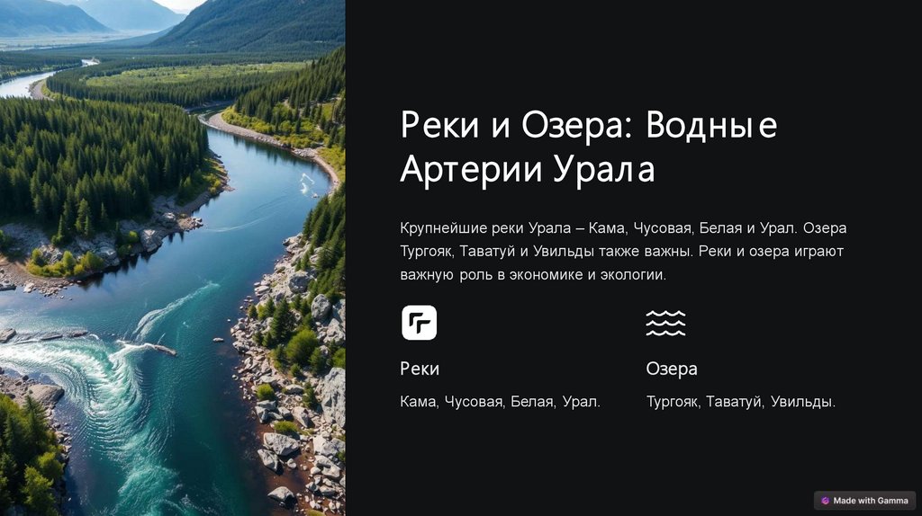 Крупнейшие реки Урала – Кама, Чусовая, Белая и Урал. Озера