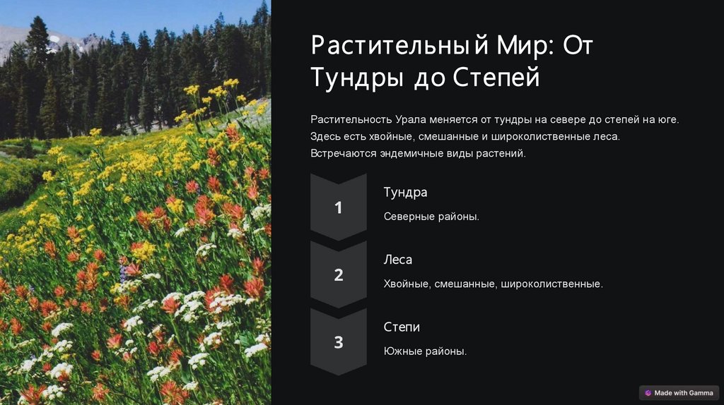 Растительность Урала меняется от тундры на севере до степей на юге.