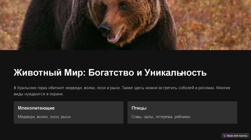 Животный Мир: Богатство и УникальностьВ Уральских горах обитают медведи, волки, лоси и рыси. Также здесь можно встретить соболей и росомах. Многие