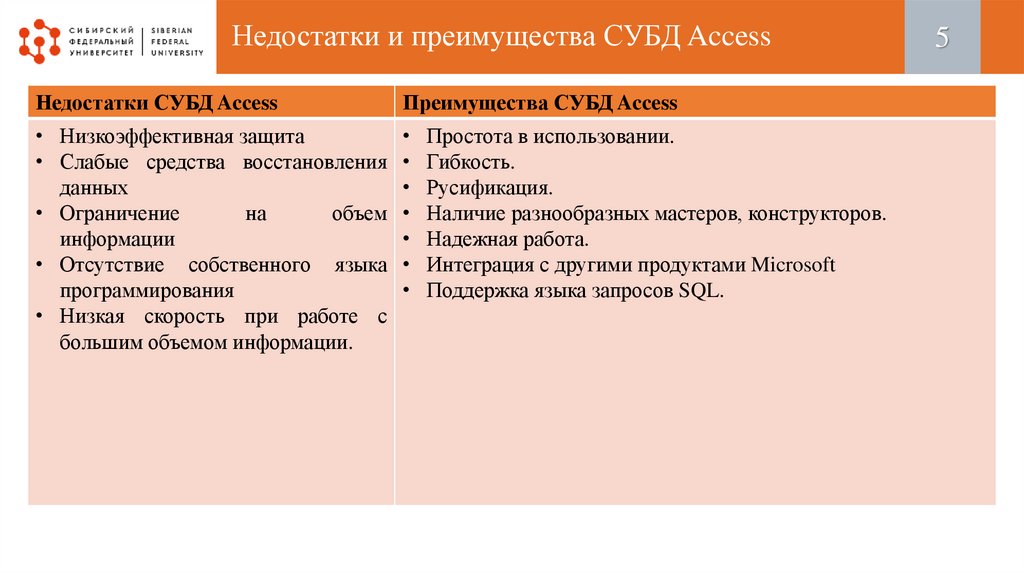 Недостатки и преимущества СУБД AccessНедостатки СУБД Access