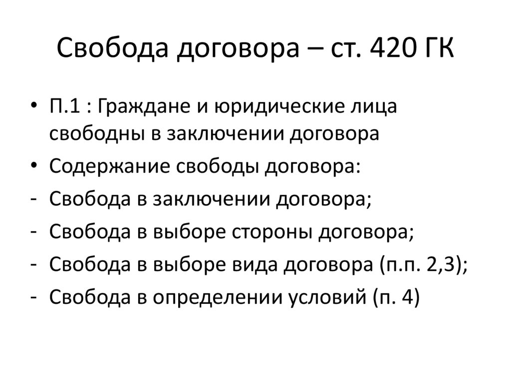 Свобода договора – ст. 420 ГК• П.1 : Граждане и юридические лица
