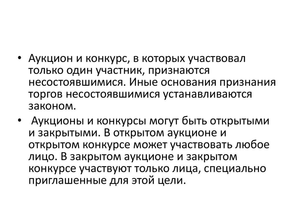 • Аукционы и конкурсы могут быть открытыми
