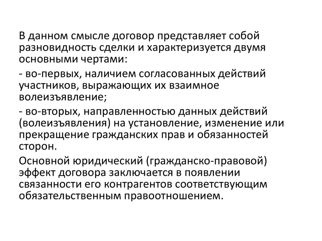 В данном смысле договор представляет собойразновидность сделки и характеризуется двумя