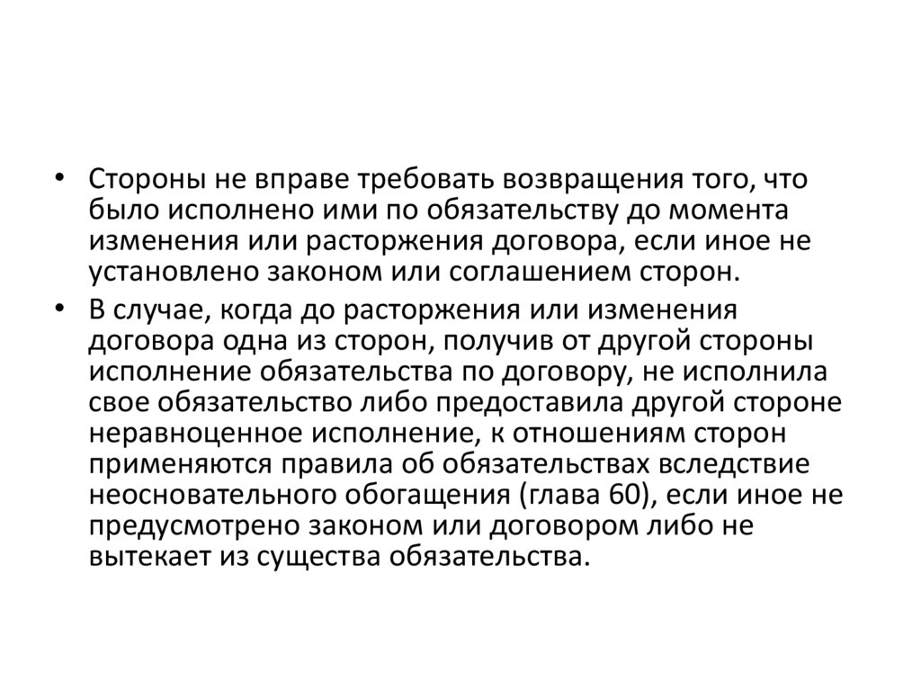 • Стороны не вправе требовать возвращения того, чтобыло исполнено ими по обязательству до момента
