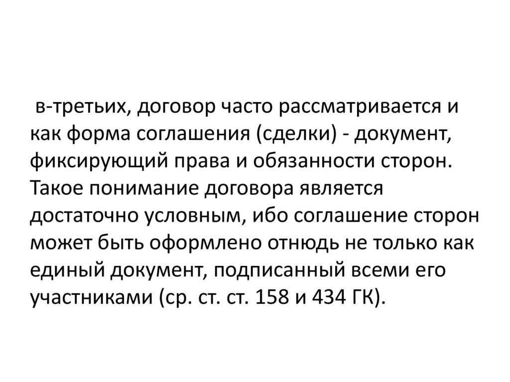 в-третьих, договор часто рассматривается икак форма соглашения (сделки) - документ,