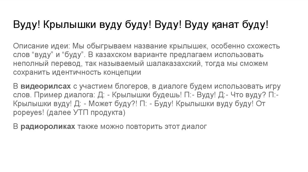 Вуду! Крылышки вуду буду! Вуду! Вуду қанат буду!Описание идеи: Мы обыгрываем название крылышек, особенно схожесть