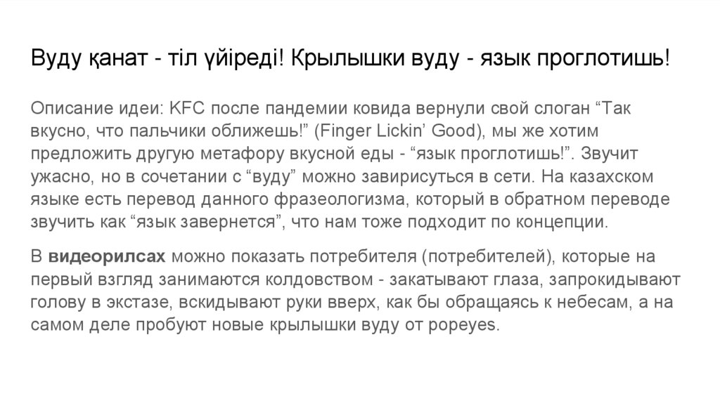 Вуду қанат - тіл үйіреді! Крылышки вуду - язык проглотишь!Описание идеи: KFC после пандемии ковида вернули свой слоган “Так