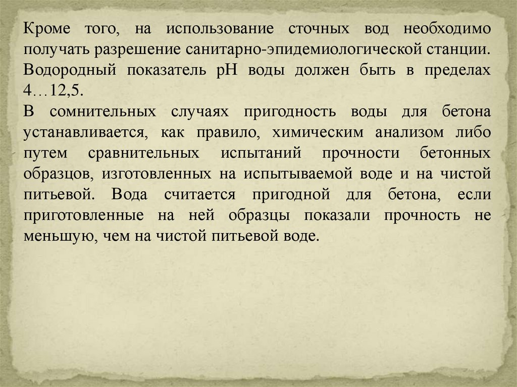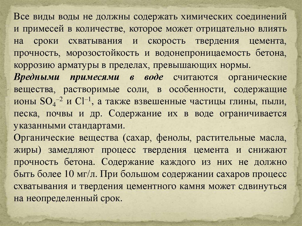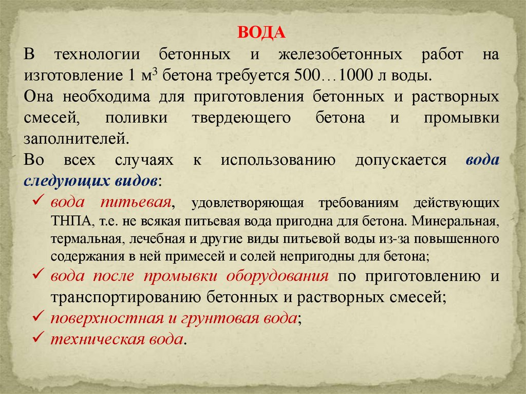 ТНПА, т.е. не всякая питьевая вода пригодна для бетона. Минеральная,