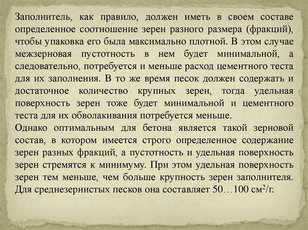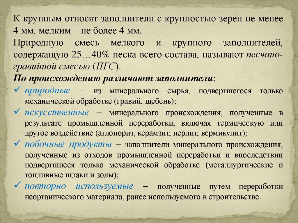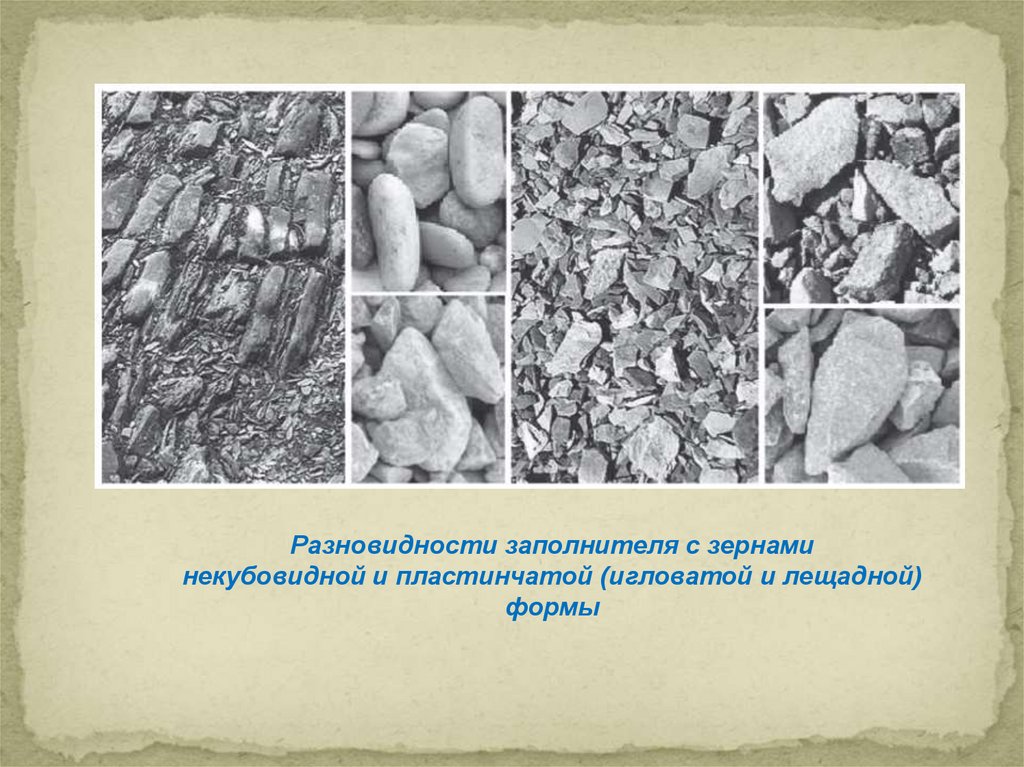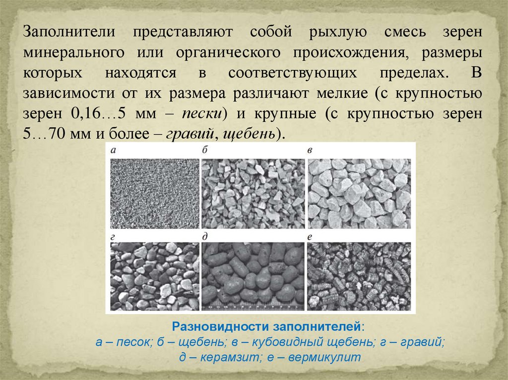 Заполнители представляют собой рыхлую смесь зеренминерального или органического происхождения, размеры