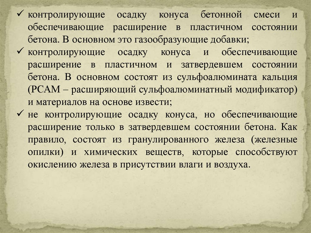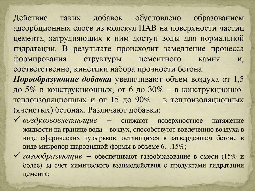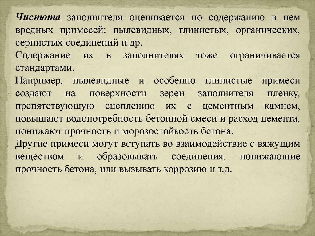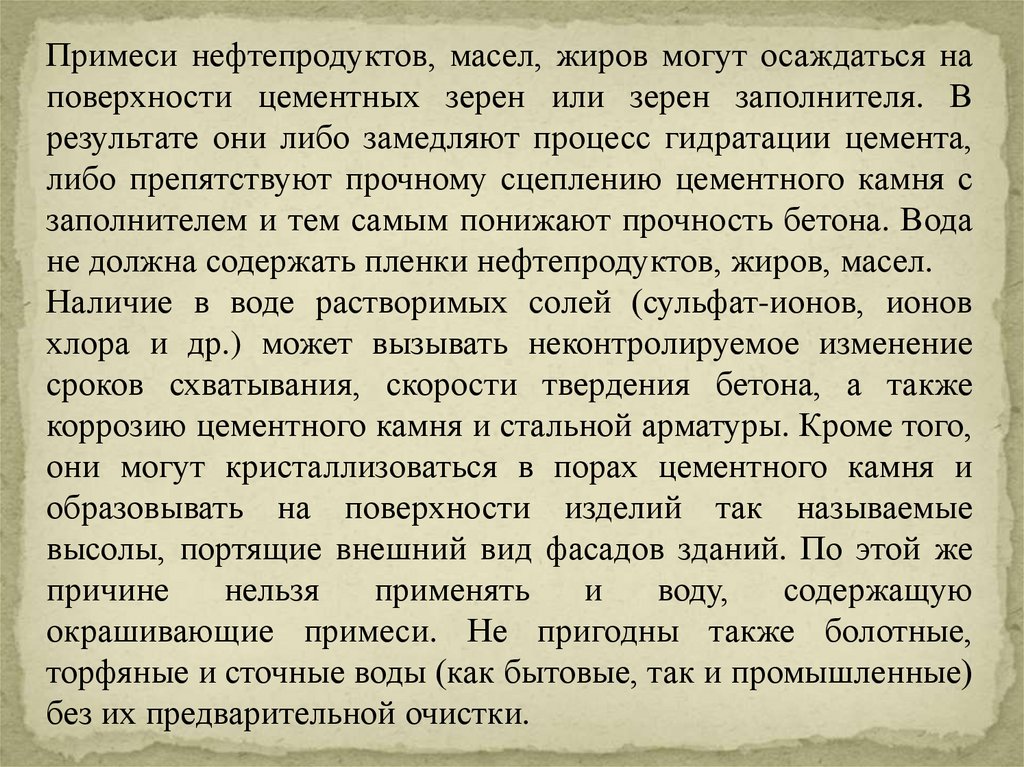 Примеси нефтепродуктов, масел, жиров могут осаждаться наповерхности цементных зерен или зерен заполнителя. В