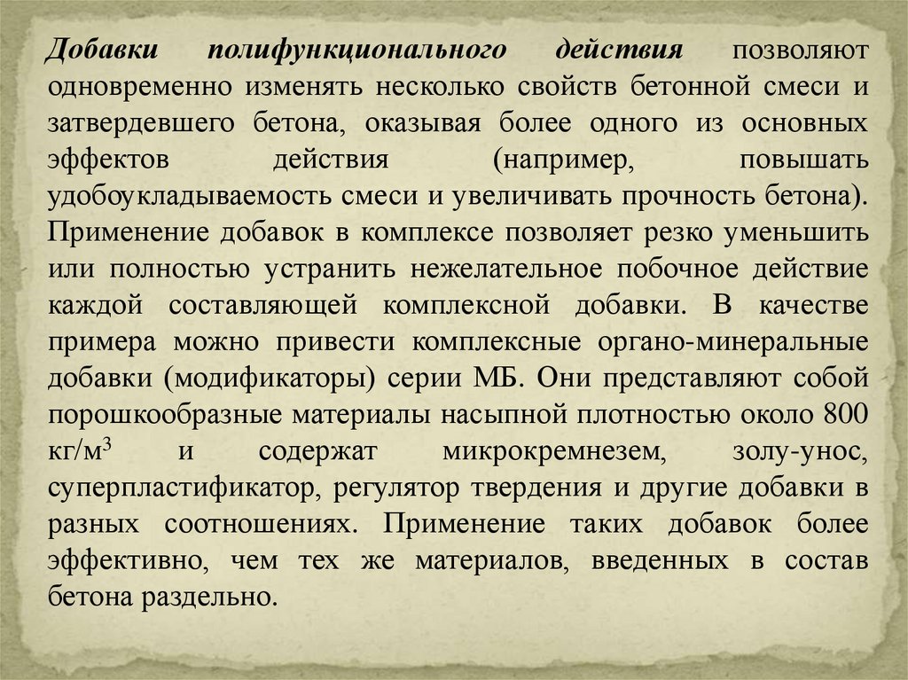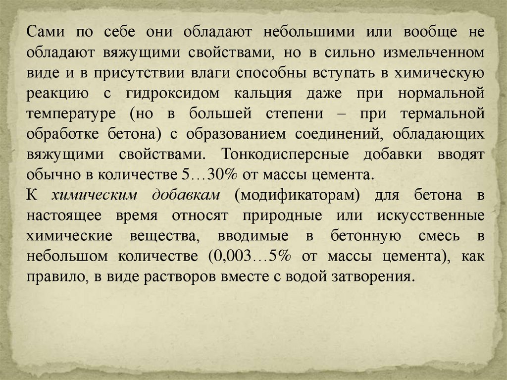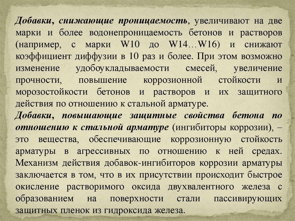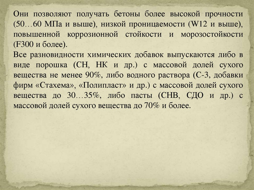 Они позволяют получать бетоны более высокой прочности(50…60 МПа и выше), низкой проницаемости (W12 и выше),