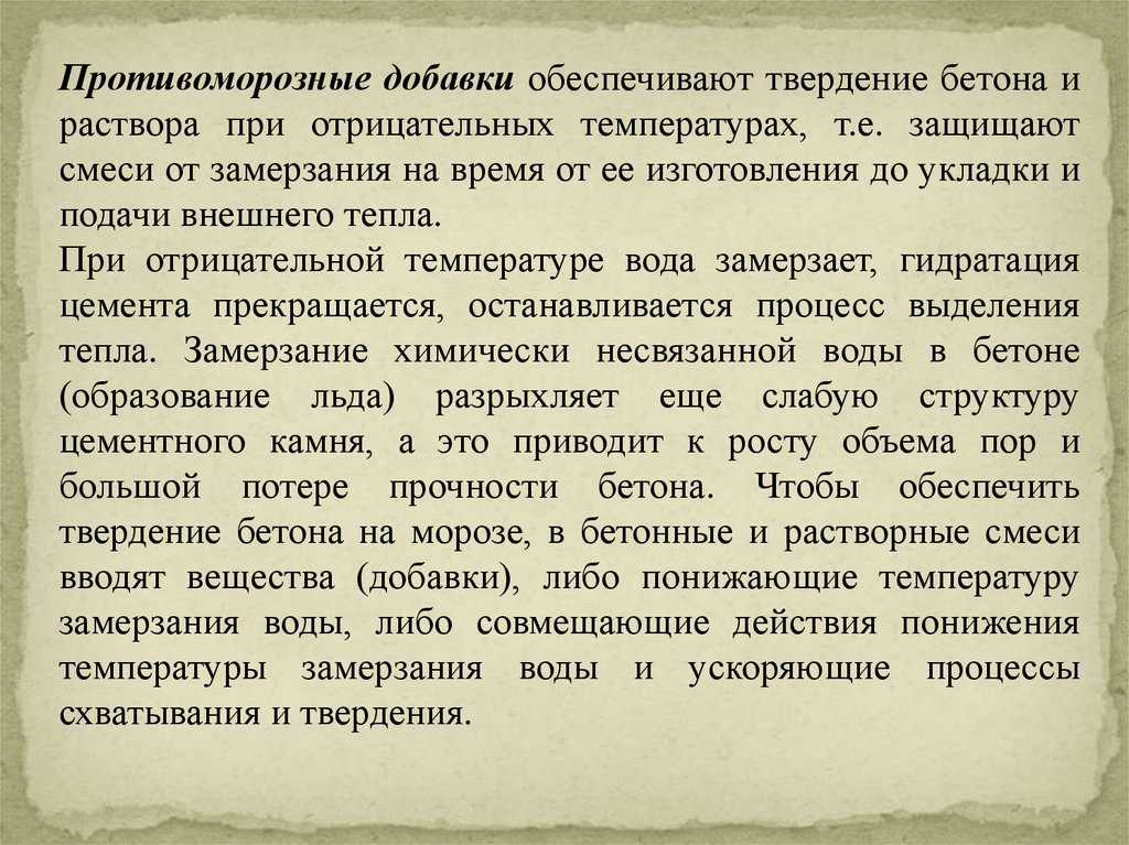 Противоморозные добавки обеспечивают твердение бетона ираствора при отрицательных температурах, т.е. защищают