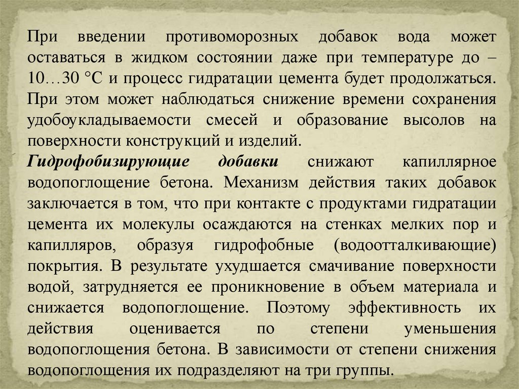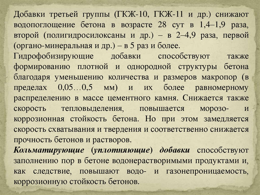 Добавки третьей группы (ГКЖ-10, ГКЖ-11 и др.) снижаютводопоглощение бетона в возрасте 28 сут в 1,4–1,9 раза,
