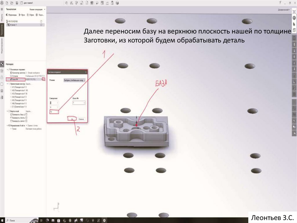 Далее переносим базу на верхнюю плоскость нашей по толщинеЗаготовки, из которой будем обрабатывать деталь