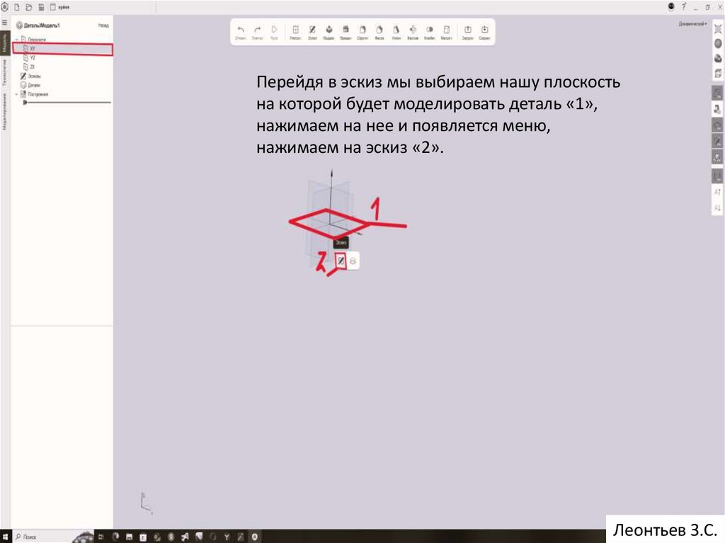 Перейдя в эскиз мы выбираем нашу плоскостьна которой будет моделировать деталь «1»,