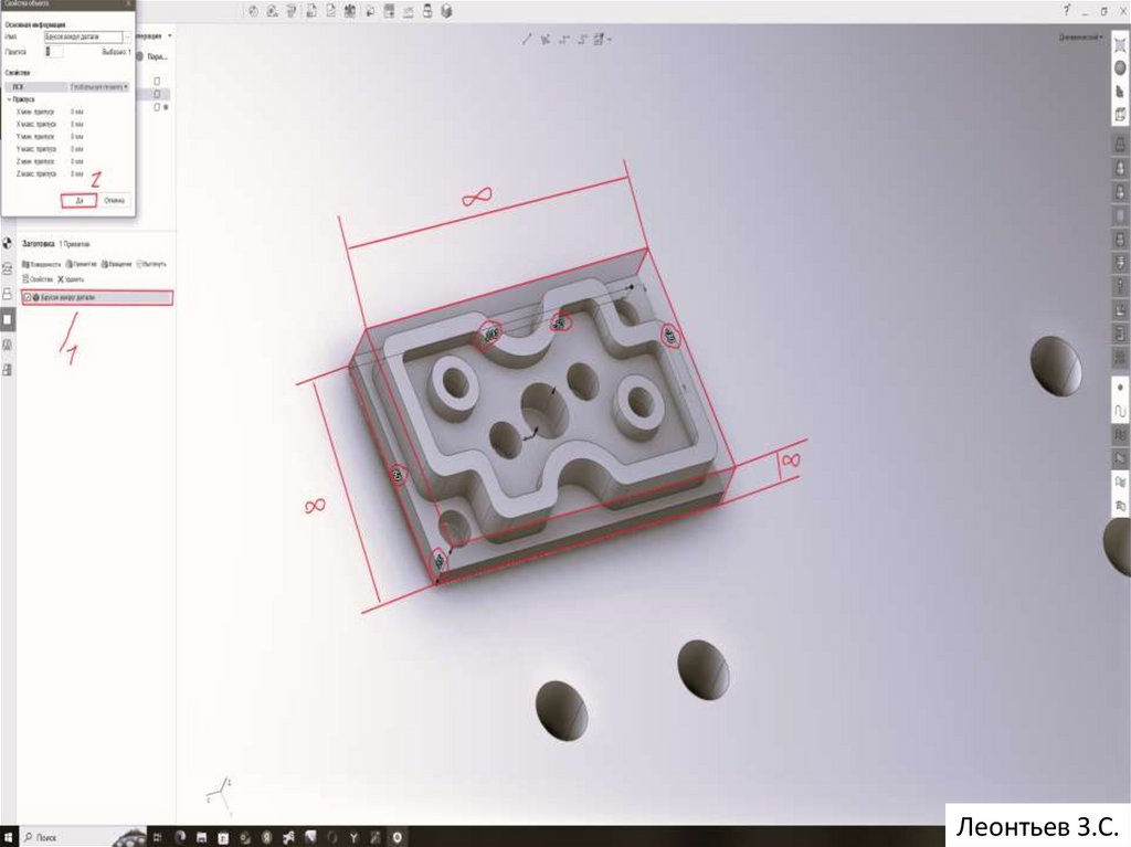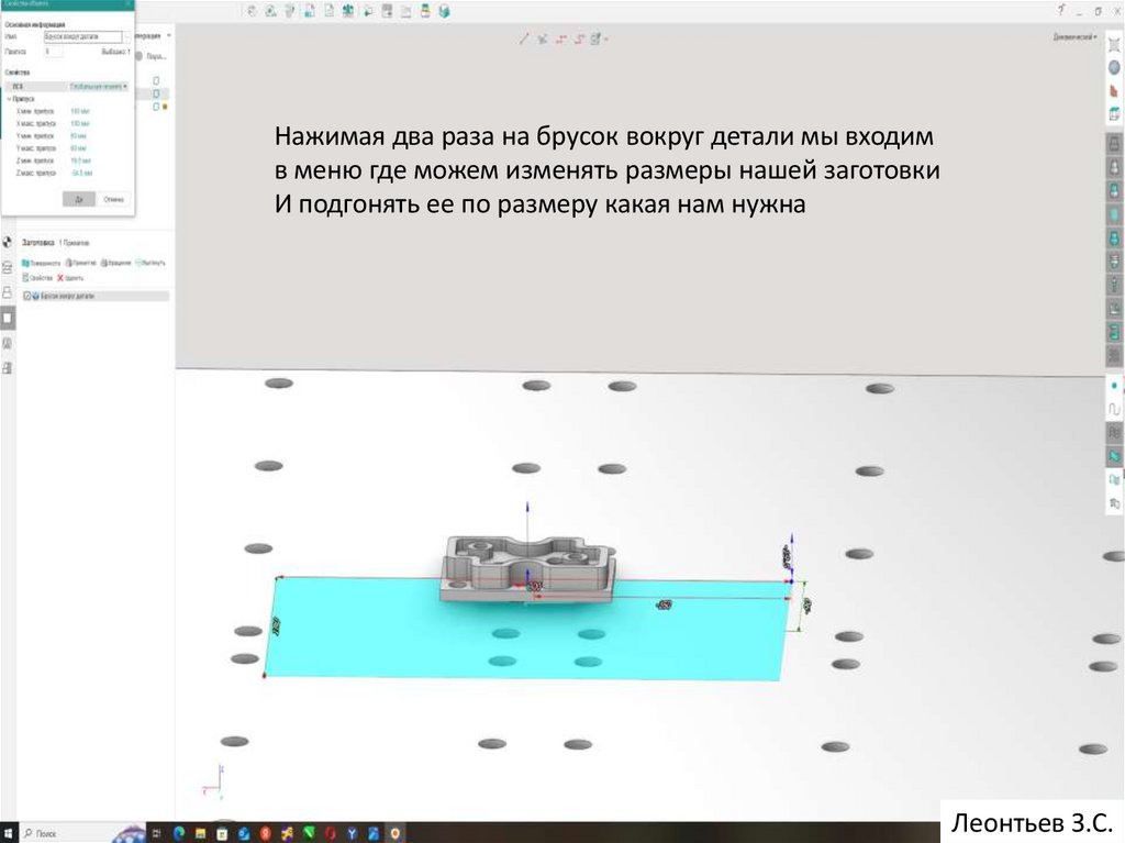 Нажимая два раза на брусок вокруг детали мы входимв меню где можем изменять размеры нашей заготовки