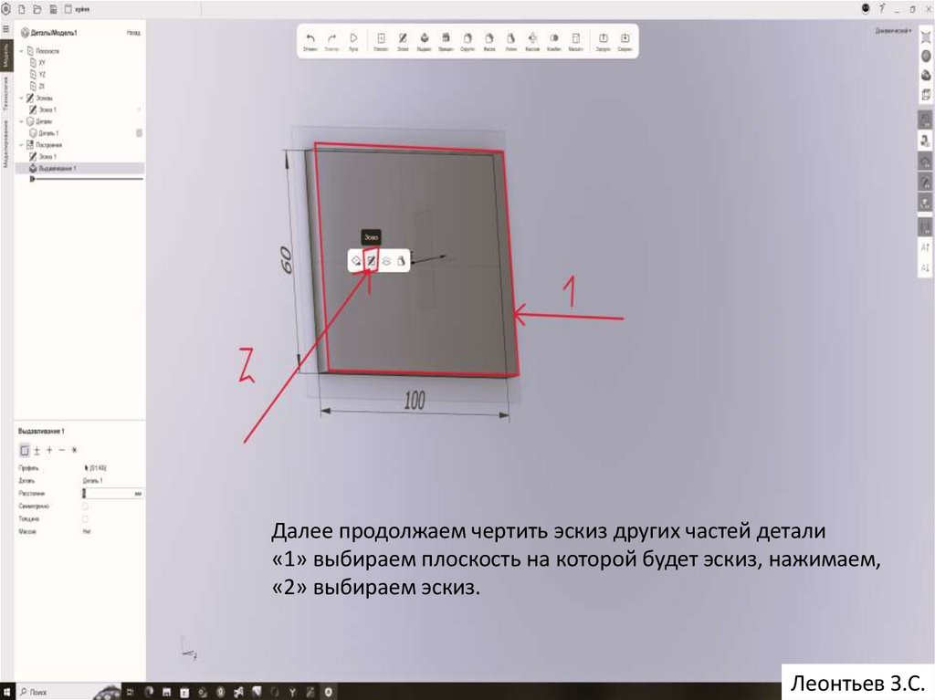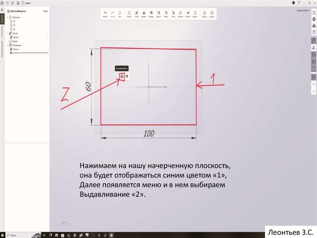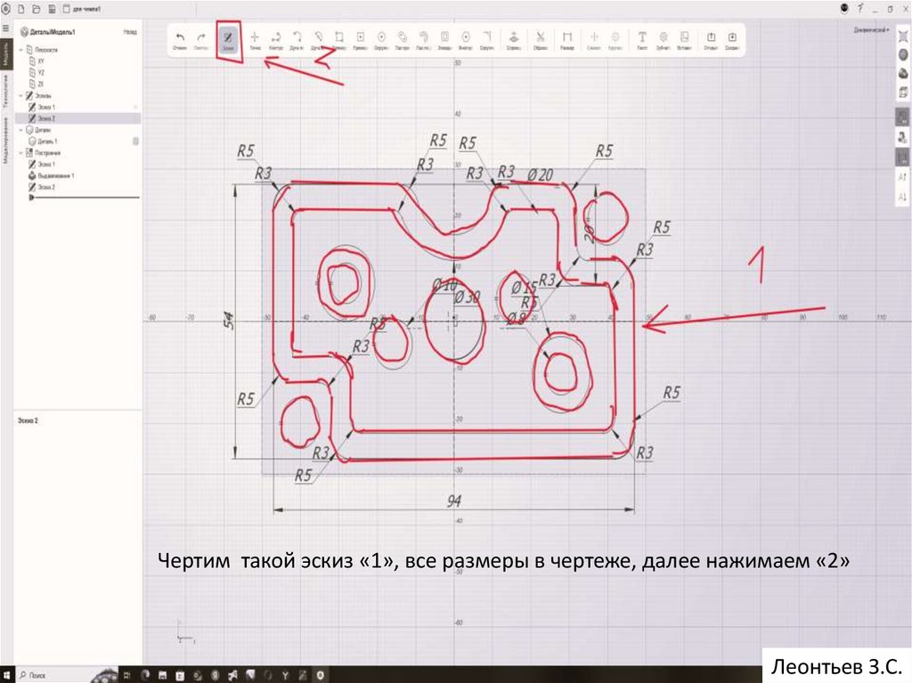 Чертим такой эскиз «1», все размеры в чертеже, далее нажимаем «2»Леонтьев З.С.