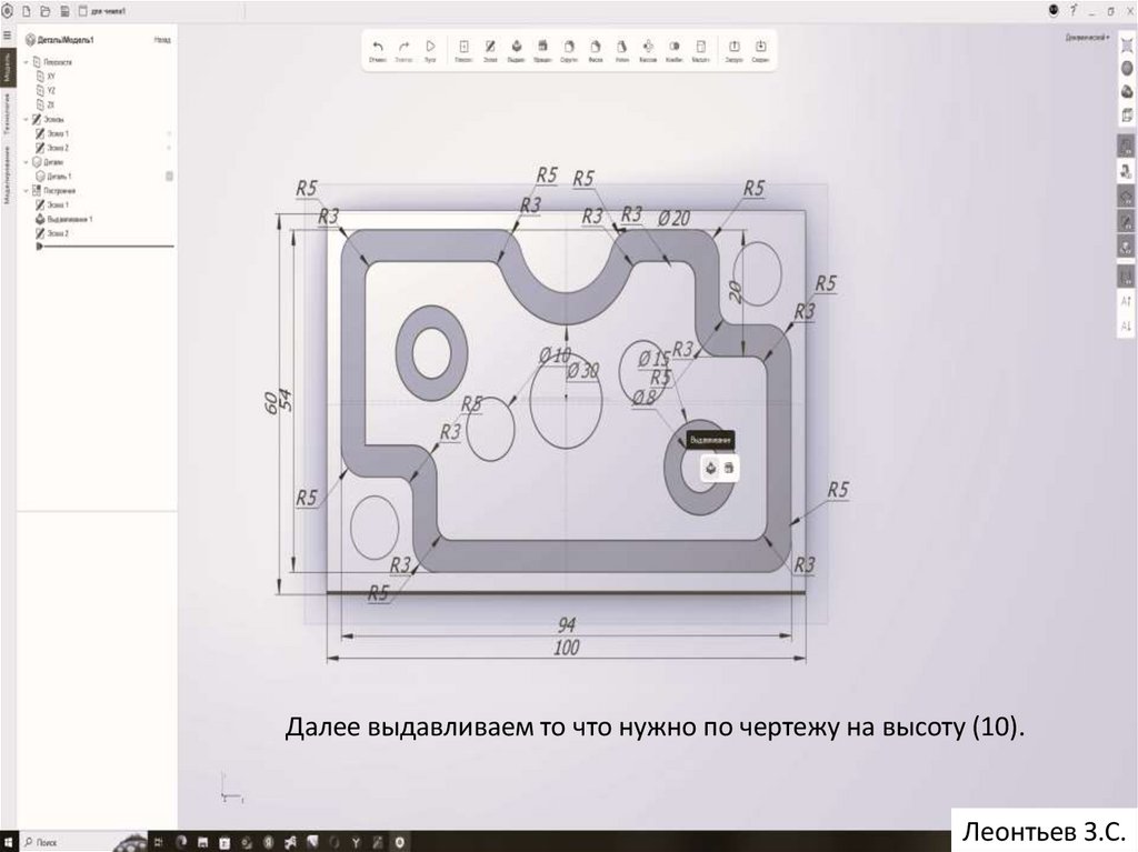 Далее выдавливаем то что нужно по чертежу на высоту (10).Леонтьев З.С.