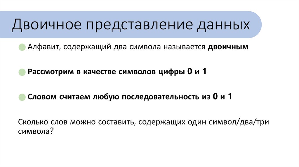 Двоичное представление данныхАлфавит, содержащий два символа называется двоичным