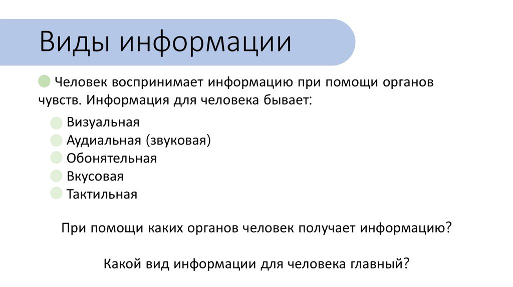 Виды информацииЧеловек воспринимает информацию при помощи органов