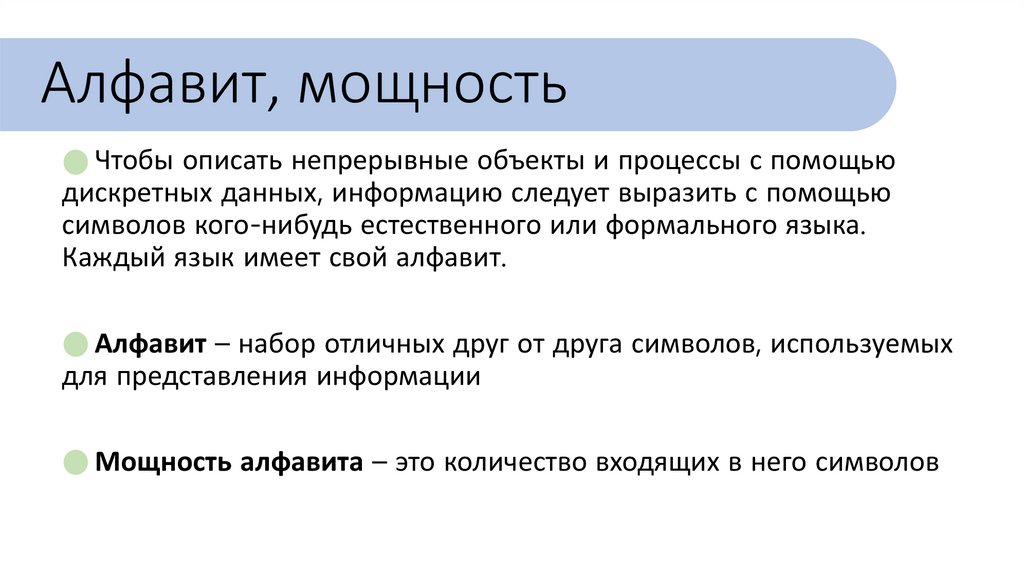 Алфавит, мощностьЧтобы описать непрерывные объекты и процессы с помощью