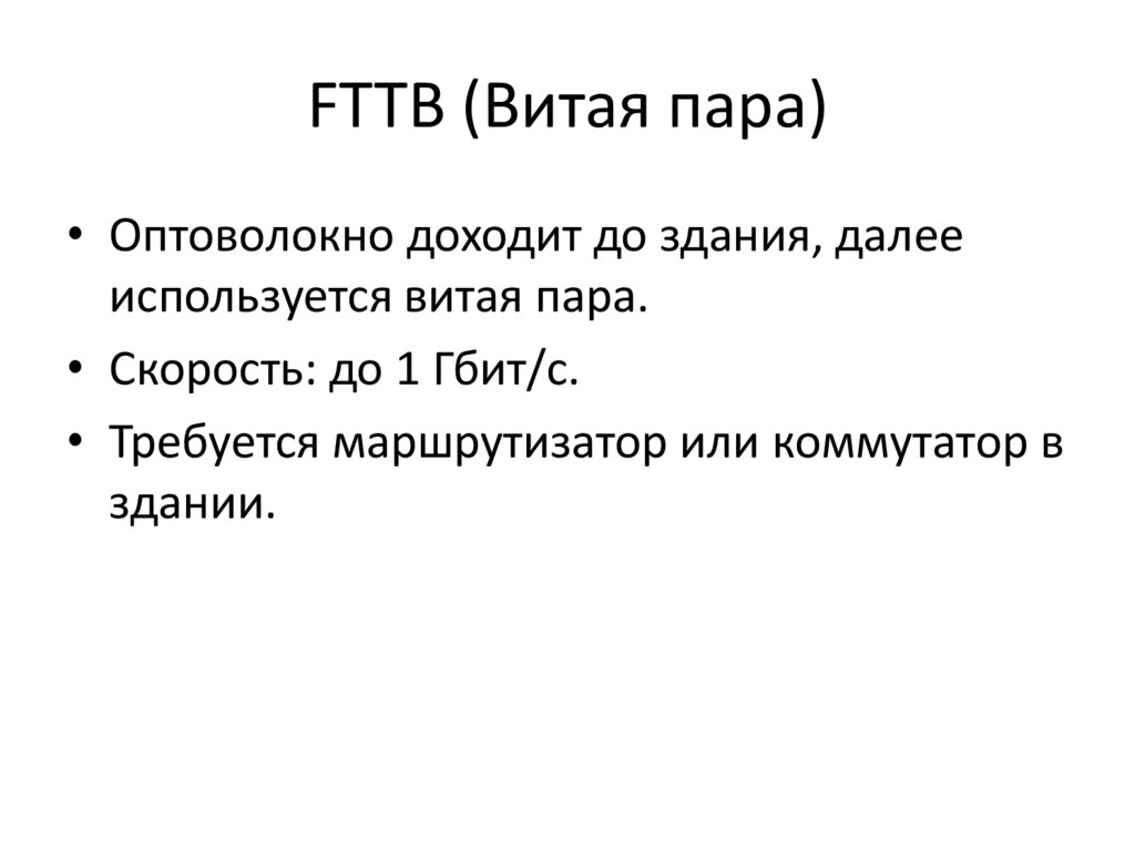 FTTB (Витая пара)• Оптоволокно доходит до здания, далее