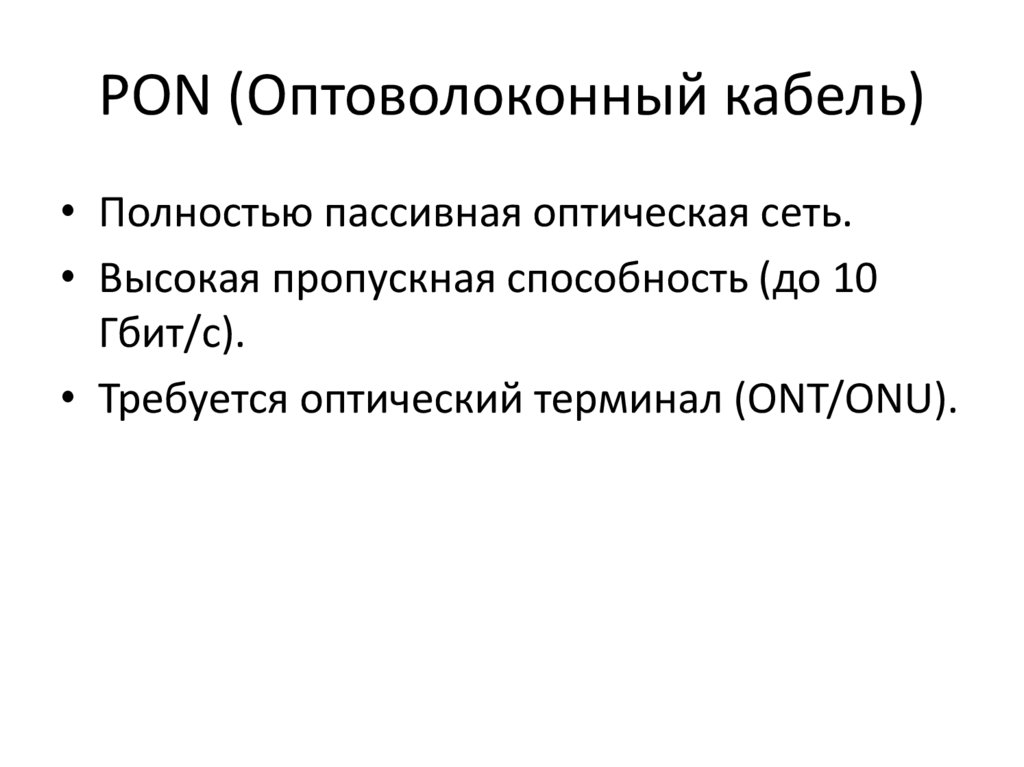 PON (Оптоволоконный кабель)• Полностью пассивная оптическая сеть.