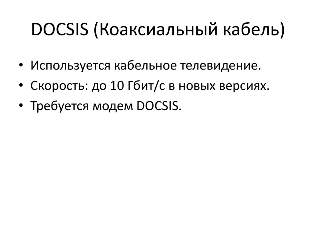 DOCSIS (Коаксиальный кабель)• Используется кабельное телевидение.