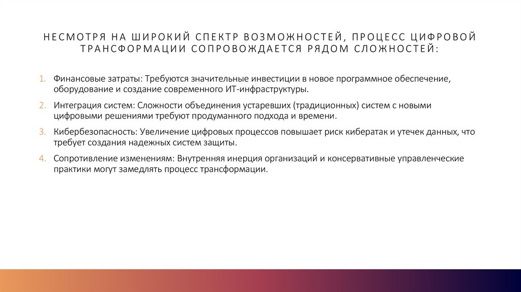 НЕСМОТРЯ НА ШИРОКИЙ СПЕКТР ВОЗМОЖНОСТЕЙ, ПРОЦЕСС ЦИФРОВОЙТРАНСФОРМАЦИИ СОПРОВОЖДАЕТСЯ РЯДОМ СЛОЖНОСТЕЙ: