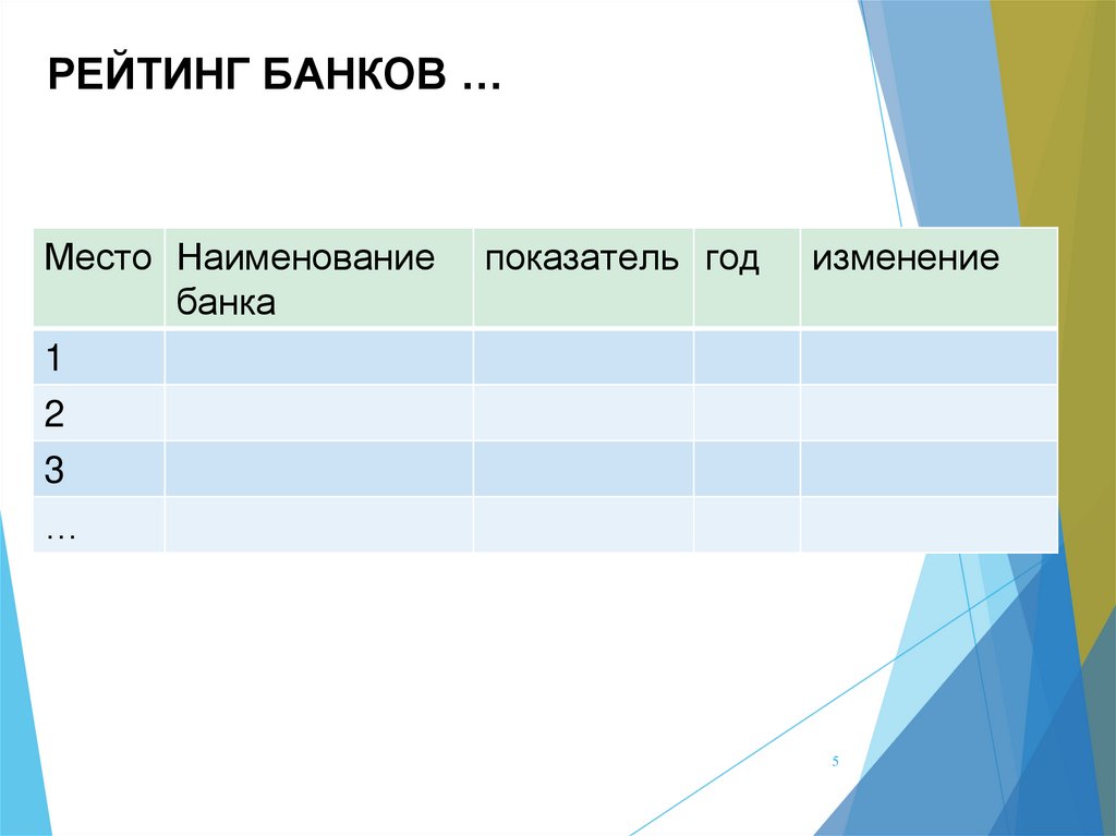 РЕЙТИНГ БАНКОВ …Место Наименование