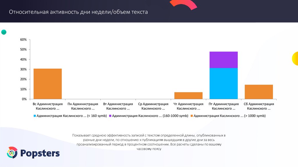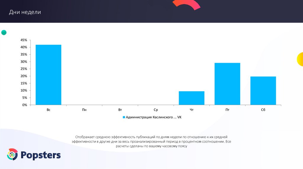 Отображает среднюю эффективность публикаций по дням недели по отношению к их средней