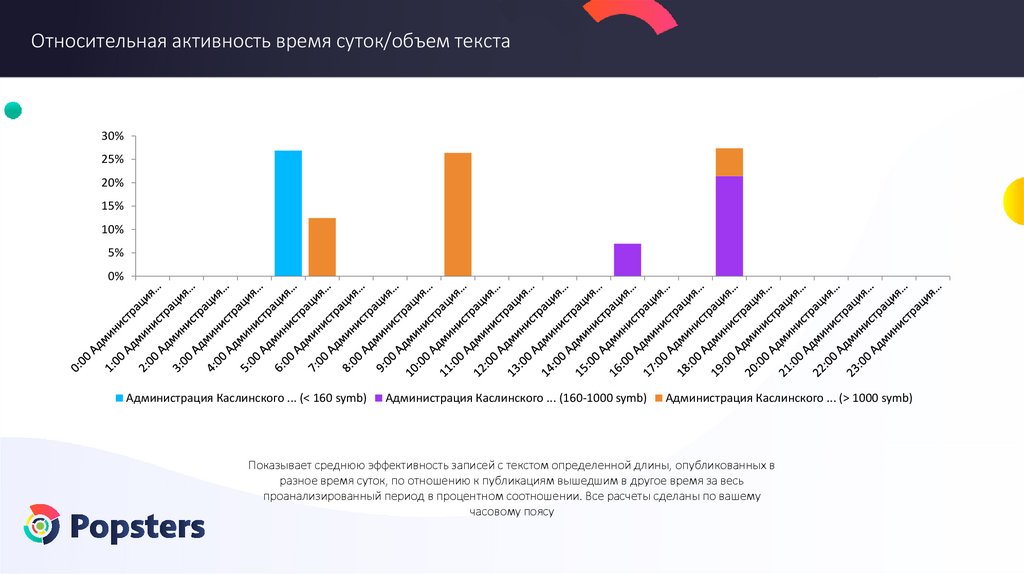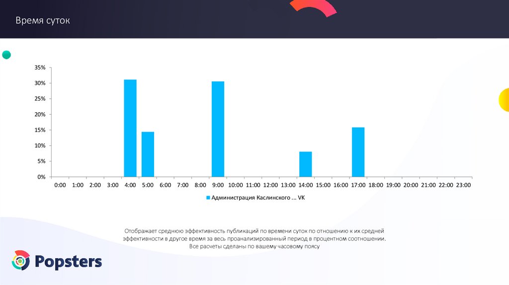 Отображает среднюю эффективность публикаций по времени суток по отношению к их средней