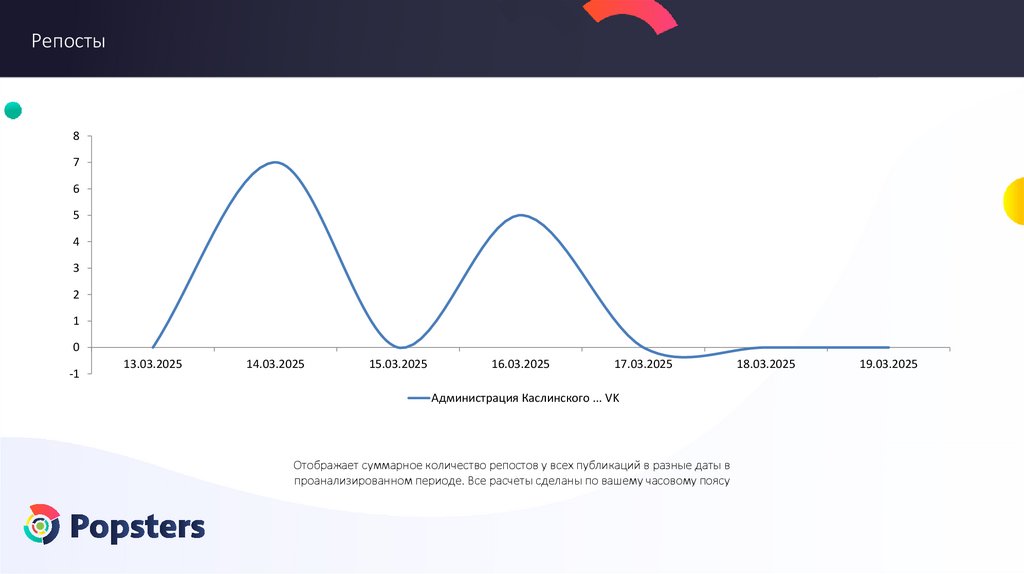 Отображает суммарное количество репостов у всех публикаций в разные даты в