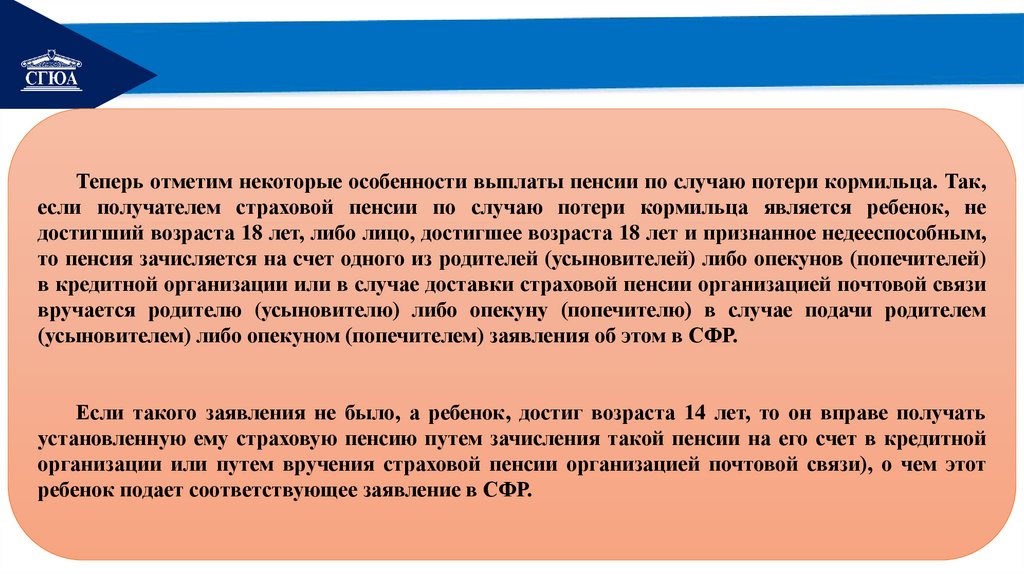 Теперь отметим некоторые особенности выплаты пенсии по случаю потери кормильца. Так,если получателем страховой пенсии по случаю потери кормильца является ребенок, не