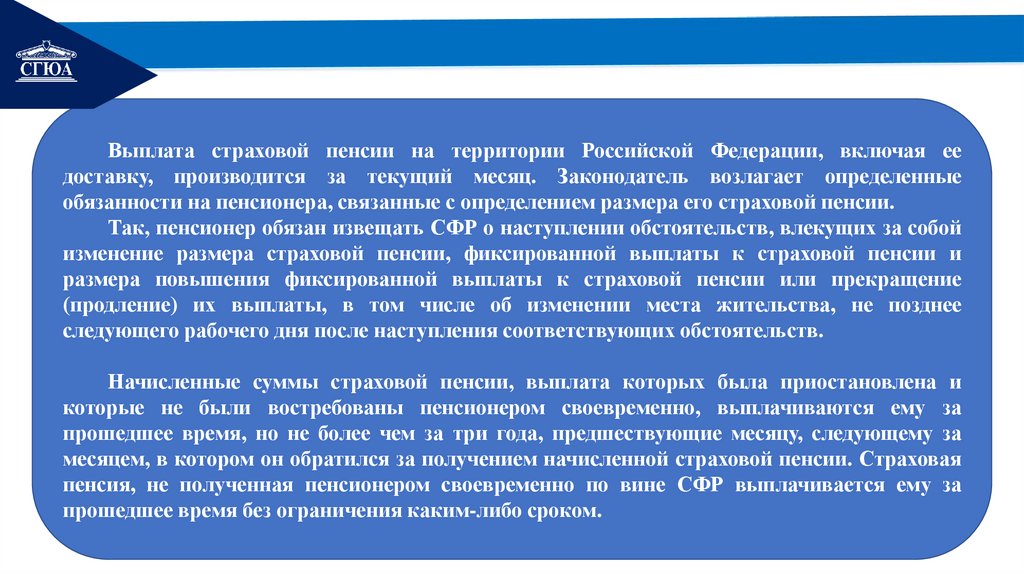 Выплата страховой пенсии на территории Российской Федерации, включая еедоставку, производится за текущий месяц. Законодатель возлагает определенные