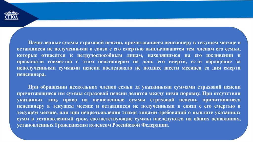 Начисленные суммы страховой пенсии, причитавшиеся пенсионеру в текущем месяце иоставшиеся не полученными в связи с его смертью выплачиваются тем членам его семьи,